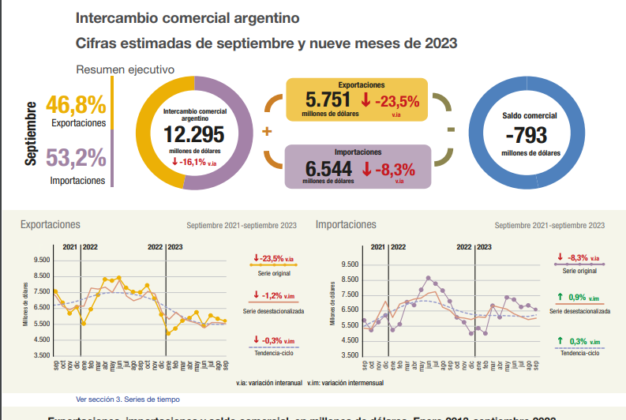 El intercambio comercial de Argentina alcanzó en septiembre un monto de 12,295 millones de dólares, 16.1% inferior a igual mes del año anterior, y con un déficit de 793 millones de dólares según datos del INDEC. En septiembre, las exportaciones alcanzaron 5,751 millones de dólares, con una caída de 23.5% interanual, y las importaciones 6,544 […]