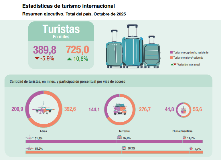 En octubre de 2025, ingresaron 679,2 mil visitantes no residentes por todas las vías de acceso al país, de los cuales 389,8 mil fueron turistas y 289,5 mil fueron excursionistas. En tanto, las salidas al exterior incluyeron a 1.228,9 mil visitantes residentes por todas las vías internacionales, de los cuales 725,0 mil fueron turistas y 503,9 mil fueron excursionistas.