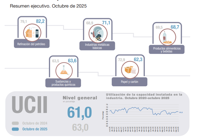 En octubre de 2025, la utilización de la capacidad instalada en la industria se ubica en 61,0%, nivel inferior al del mismo mes.