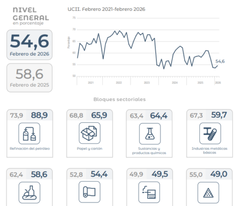 La utilización de la capacidad instalada en la industria se ubica en 54,6% en febrero, nivel inferior al del mismo mes de 2025, que fue de 58,6%.