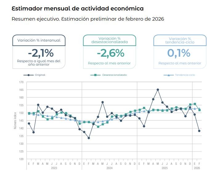 En febrero de 2026, el estimador mensual de actividad económica (EMAE) registró una caída de 2,1% en la comparación interanual (i.a.) y de 2,6% respecto a enero en la medición desestacionalizada.
