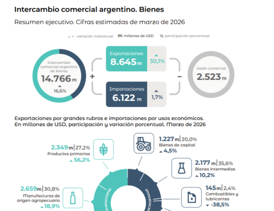 En marzo, las exportaciones alcanzaron un récord histórico de USD 8.645 millones y las importaciones ascendieron a USD 6.122 millones. El intercambio comercial (exportaciones más importaciones) aumentó 16,6% en relación con igual mes del año anterior, y totalizó un monto de USD 14.766 millones. La balanza comercial registró un superávit de USD 2.523 millones, con un resultado positivo por vigésimo octavo mes consecutivo.
