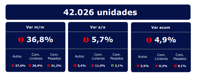 A nivel nacional el mercado automotor registró en febrero 42.026 patentamientos, lo que representa una caída del 5,7% frente al mismo mes del año anterior. En el acumulado del año, los patentamientos acumulan una baja del 4,9% interanual.