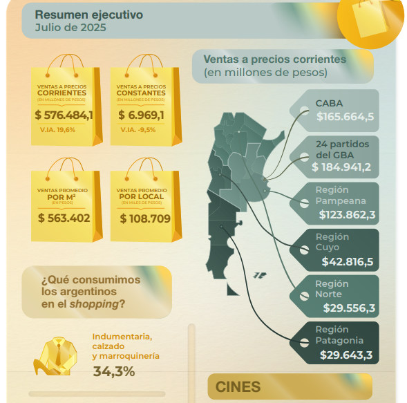 Las ventas totales a precios corrientes en julio de 2025 reflejaron que los rubros con mayor incremento, según su variación interanual, fueron: “Juguetería”, con 45,4%; “Patio de comidas, alimentos y kioscos”, con 39,0%; “Amoblamientos, decoración y textiles para el hogar”, con 33,0%; y “Perfumería y farmacia”, con 30,5%.